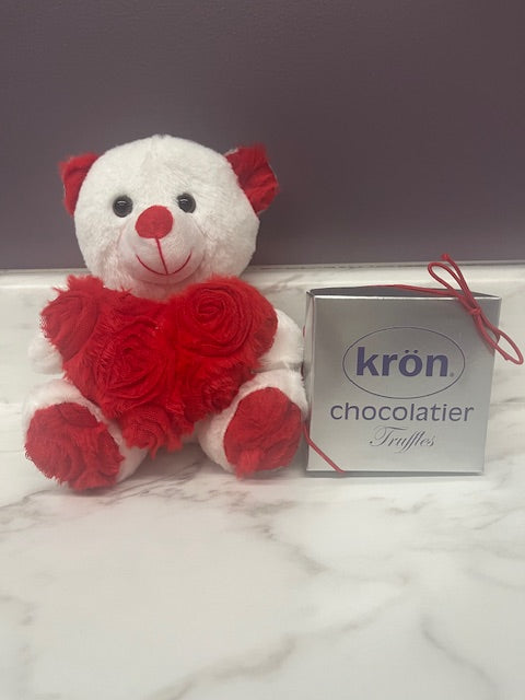 7" white teddy bear holding a rosette heart and an 8 piece assortment of truffles